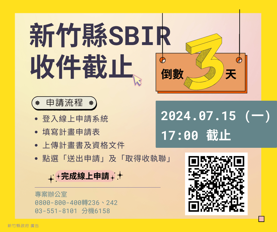 新竹縣SBIR收件截止提醒!! 只剩3天~