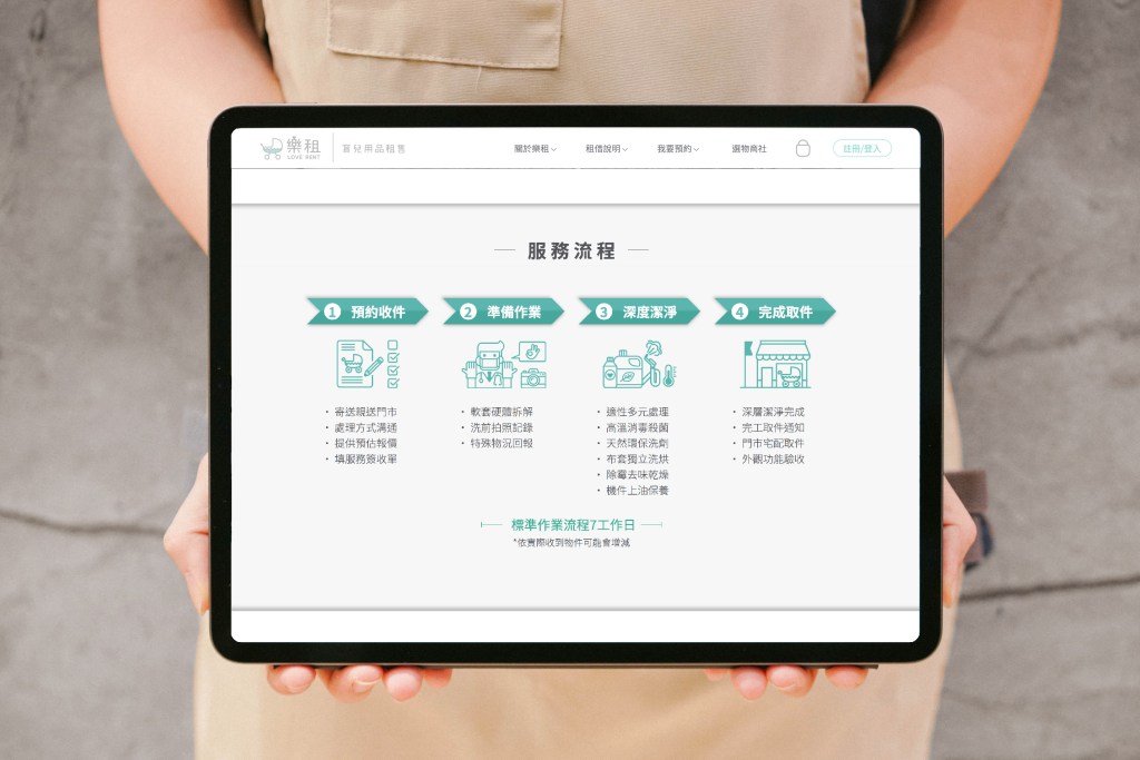 - 在目前育兒用品租借平台網站上,整合即有的會員資料,建立新的金流(清潔費用)及新的清潔預約系統(預約人力產能)。