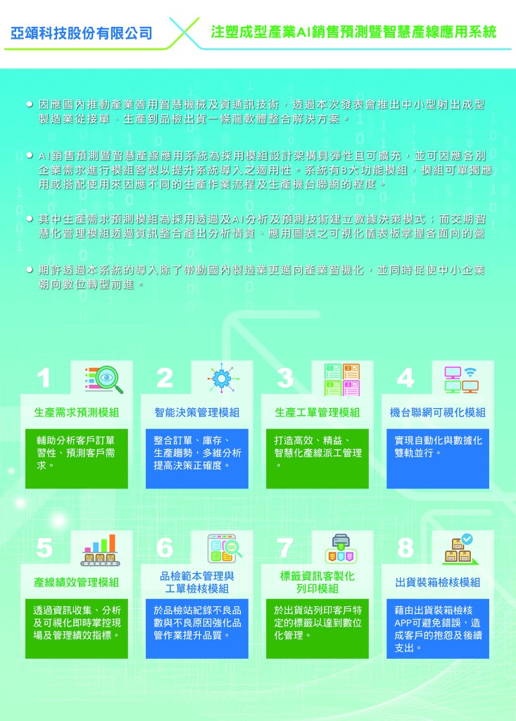 為因應中小企業核心需求,在合理與可行的預算下輔助廠商解決核心痛點,完成產出【AI銷售預測暨智慧產線應用系統】一式,結合AI銷售預測、SMB機聯網與報表軟體應用等核心三大模組,其子功能模組包含生產需求預測、交期智慧化管理、生產工單管理、產線績效管理、機台聯網可視化、品檢電子表單、出貨裝箱檢核及標籤資訊客製列印,以八個精簡核心模組接軌廠商原Excel等管理模式,並依據廠商管理需求客製達成導入目標,提供完整製程管理服務,促進產業升級。