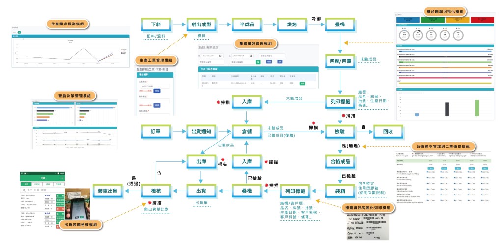 從銷售預測端合作導入AI輔助銷售數據分析機制,建構銷售預測之生產決策模組,往下鏈結至現場工單整合報工數位化,建構模組化生產戰情中心,掌握人/機/料工單串聯整合,即時統計生產戰情模組;在系統端與客戶出貨數據整合,導入標籤管理與檢核模組,可加速出貨資訊檢驗完成程序,並建構報表統計應用模組,促進生產規劃決策優化。