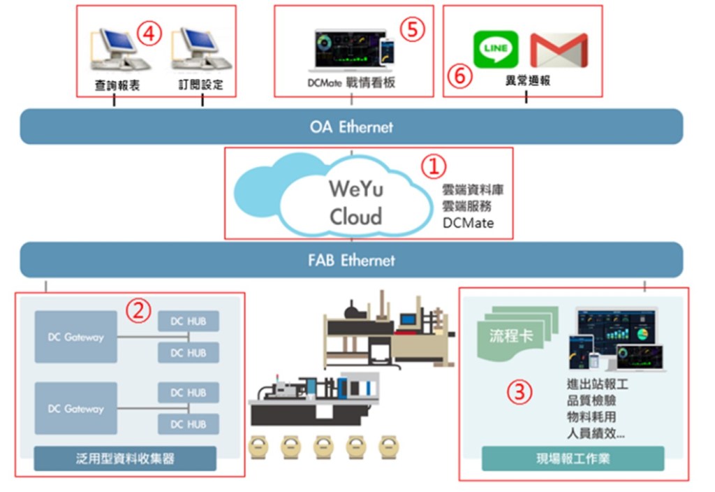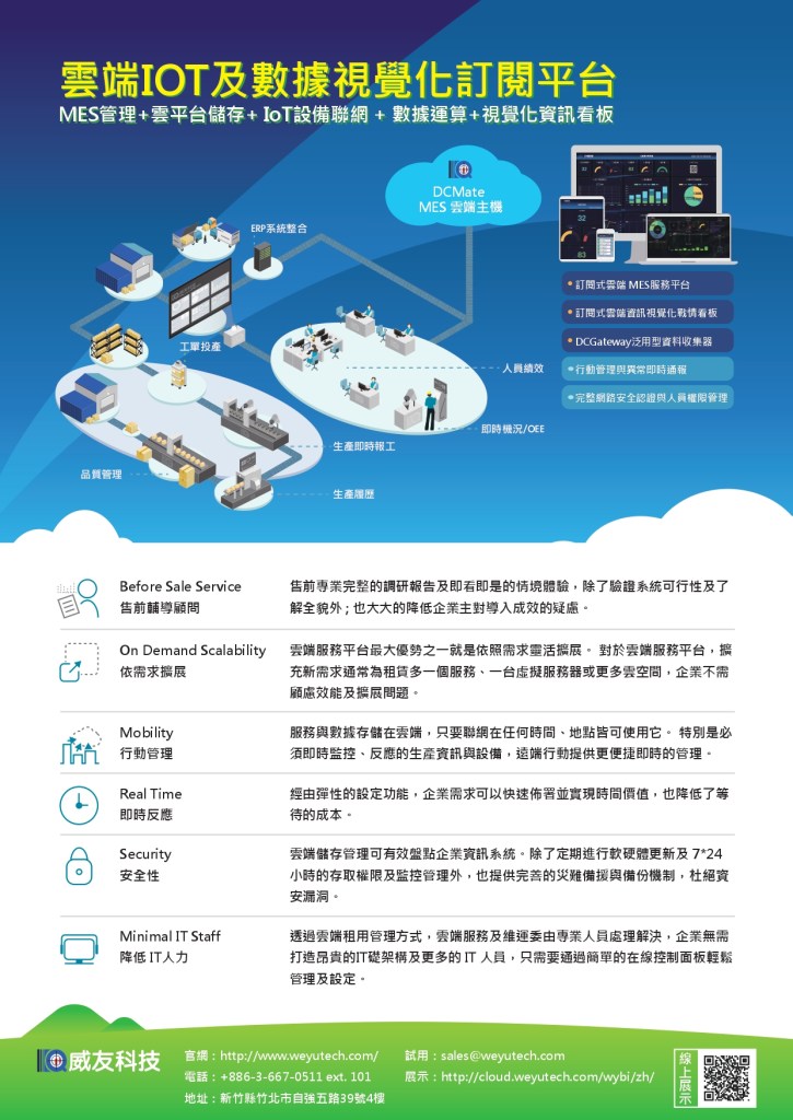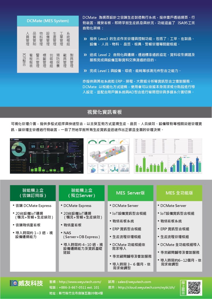 - 一條龍完整解決方案,整合範圍從底層的生產設備IoT聯網到高層之管理資訊視覺化。