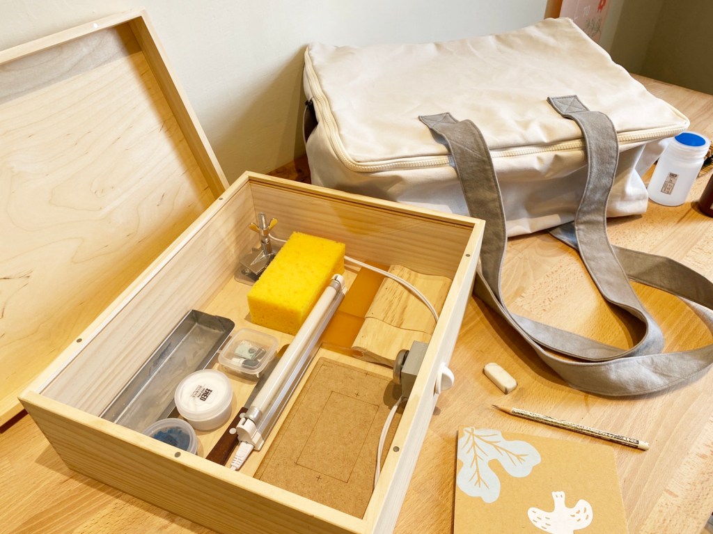 因此,工作室討論規劃設計開發一系列在家玩絹印的DIY 絹印套組,讓民眾在家也能體驗絹印,讓學校或是個人家庭也可以透過這燈箱進一步自行製版絹印,搭配線上的影片操作教學,不須出門也可以完成,此商品設計為木箱形式,讓原本曬版機冰冷的形象翻轉,使用較安全低瓦數的紫外燈,操作簡易安全。