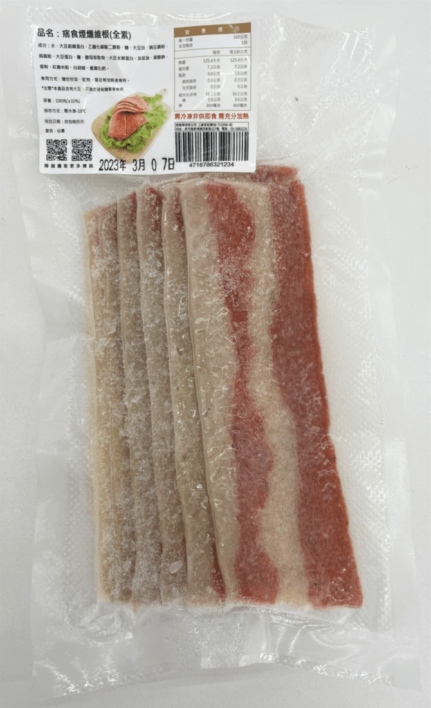 1、產出煙燻維根產品一式,並與市售素培根相比少了54.8% 脂肪含量及15.7% 之鈉含量。