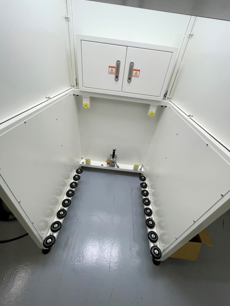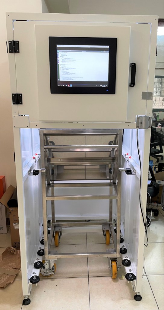只須將廠內L 型推( 台) 車推入該檢測設備中,5 秒內便可顯示PCB 數,正確率達100%。系統含「新板學習系統」,只須配合系統畫面步驟,即可建置並學習新板辨識資料,並符合大廠所需之資訊化、數據化、直覺化的要求。