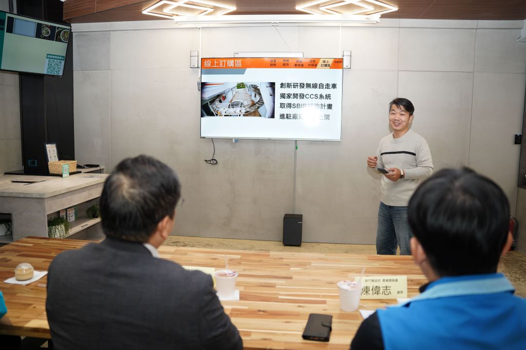 新竹縣政府持續關心「地方產業創新研發推動計畫(地方型SBIR)」廠商研發需求及成果,縣長楊文科昨(12日)親自走訪亮點企業之一「新快取股份有限公司」,了解創新歷程及成果,並參觀該公司於110年度獲政府補助開發的全國首座「跨車道軌道自動送餐系統」,同時體驗內用區QRcode線上點餐及首創複合型快取車道,大讚該公司積極嘗試開發各種智慧系統,讓民眾生活更便利。
