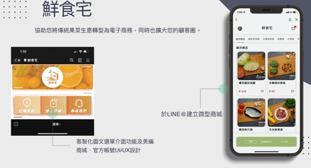 由於新冠疫情影響,為避免人流接觸,多數家庭降低出門次數,也減少去傳統市場採購的頻率,而一次性大量採購生鮮食品造成後續蔬果保鮮之問題。本計畫開發「鮮食宅數位化蔬果」平台,團隊透過後台管理系統開發與LINE 平台架構進行串接,提供整合式物流配送服務,具備「智慧物流、訂單彙整、FB 生鮮團購」三大功能,讓蔬果商能智慧化進行物流配送,提供消費者便利化的購物體驗,下單取貨一指搞定,同時業者可透過「FB 生鮮團購、訂單彙整、智慧物流」三大功能完成配送且各別擁有自己的販售系統,不僅可以管理消費者之訂單需求,還可自由上架產品,不必擔心有第三方金流抽取過高之利潤,而導致獲利受損,更能將客戶資料完整掌握,連結客端Facebook 與LINE 帳號,提升再行銷的可能性。