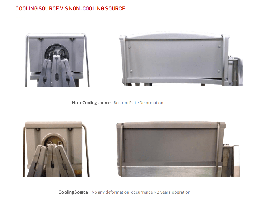 離子植入製成環境長時間800℃高溫常導致UP Chamber鎢板底座變形,變形後造成內部反應氣體外洩,原廠設計之本體有一冷卻水路但和UP Chamber中間間格30mm高度以非接觸式冷卻,無法有效率帶走製程高溫約15個工作天需下機PM,新計畫之雙通道冷卻器在本體上方增加一長方形底座,並在底座內增加一循環水路。底座直接接觸UP Chamber下方給予直接冷卻,達到UP Chamber鎢底板不再因製成高溫變形問題。