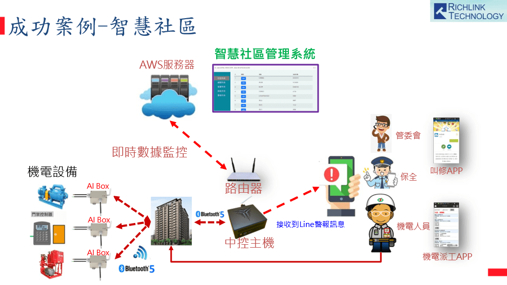 2.社區服務雲端化-建立物聯網基礎平台,社區重要設備維護人力派遣省時省力。本團隊研發網關中控盒、報警器、插座型中繼器、中繼器…等設備,將現有設備透過藍牙5.0系統傳送資料,即時掌握各種系統狀態。