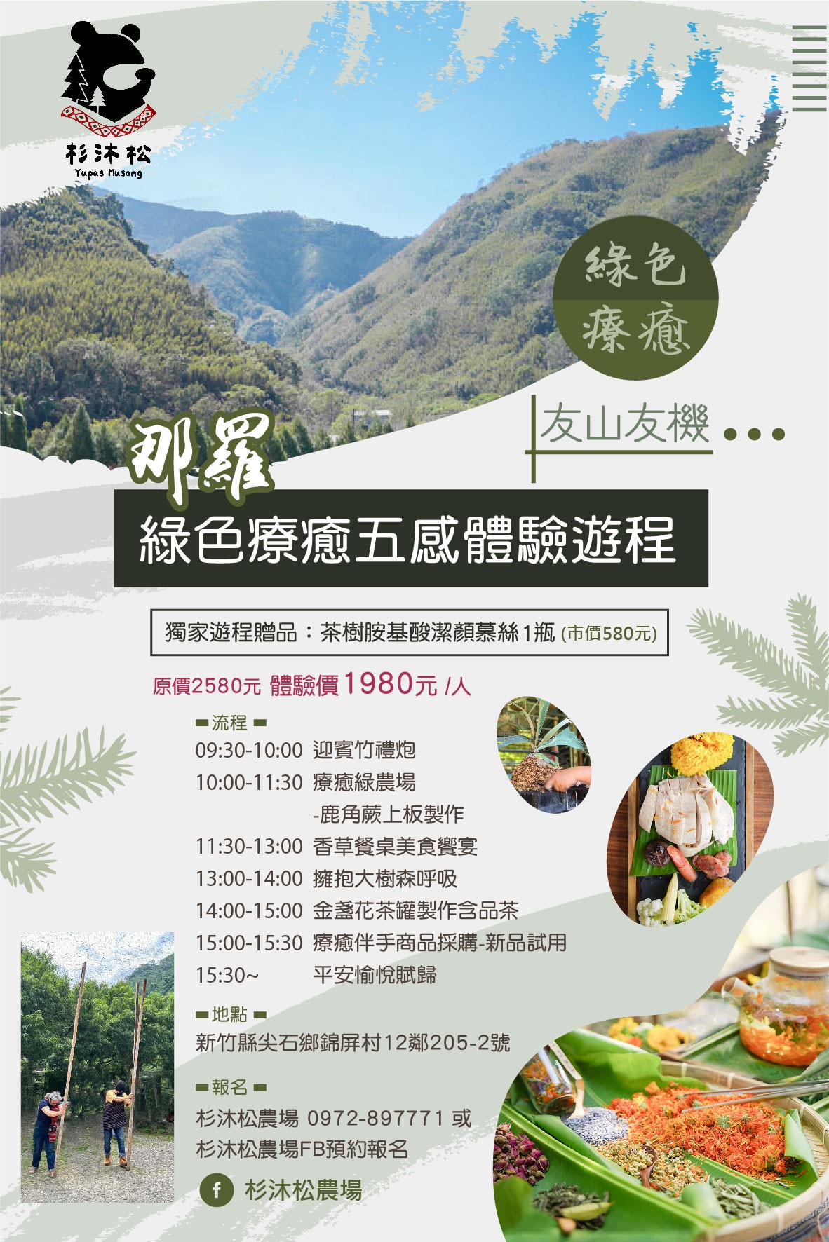 - 打造那羅部落綠色療癒遊程,創造部落新商機,引領全民森呼吸:本農場重視國人身、心、靈的健康與部落永續發展的前提下,推出創新【那羅泰好玩-香草森呼吸】五感體驗遊程。